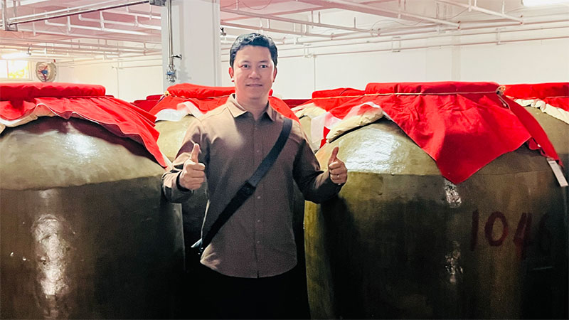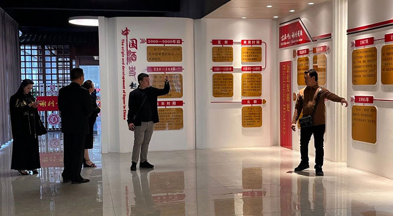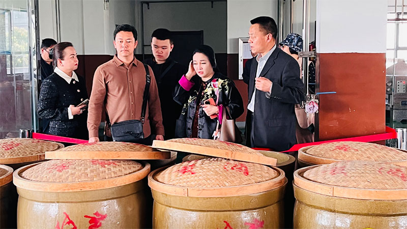 商会领导、公司领导陪同越南客商们参观了展销大厅、秦洋厂史馆、秦洋名酒馆、地下陶坛酒库、白酒酿造车间、黄酒发酵车间、谢村黄酒非遗传习所、白酒成装车间等部门。参观过程中,副总经理吴东平给大家介绍了古秦洋酒、谢村黄酒的历史文化、生产工艺及产品特点,回答了越南客商提出的关于公司产能规模、产品优势等方面的问题,邀请客人们品尝了已经陈藏40多年的古秦洋原浆酒及刚开缸的手工原汁谢村黄酒,客人们翘指称赞不已。
